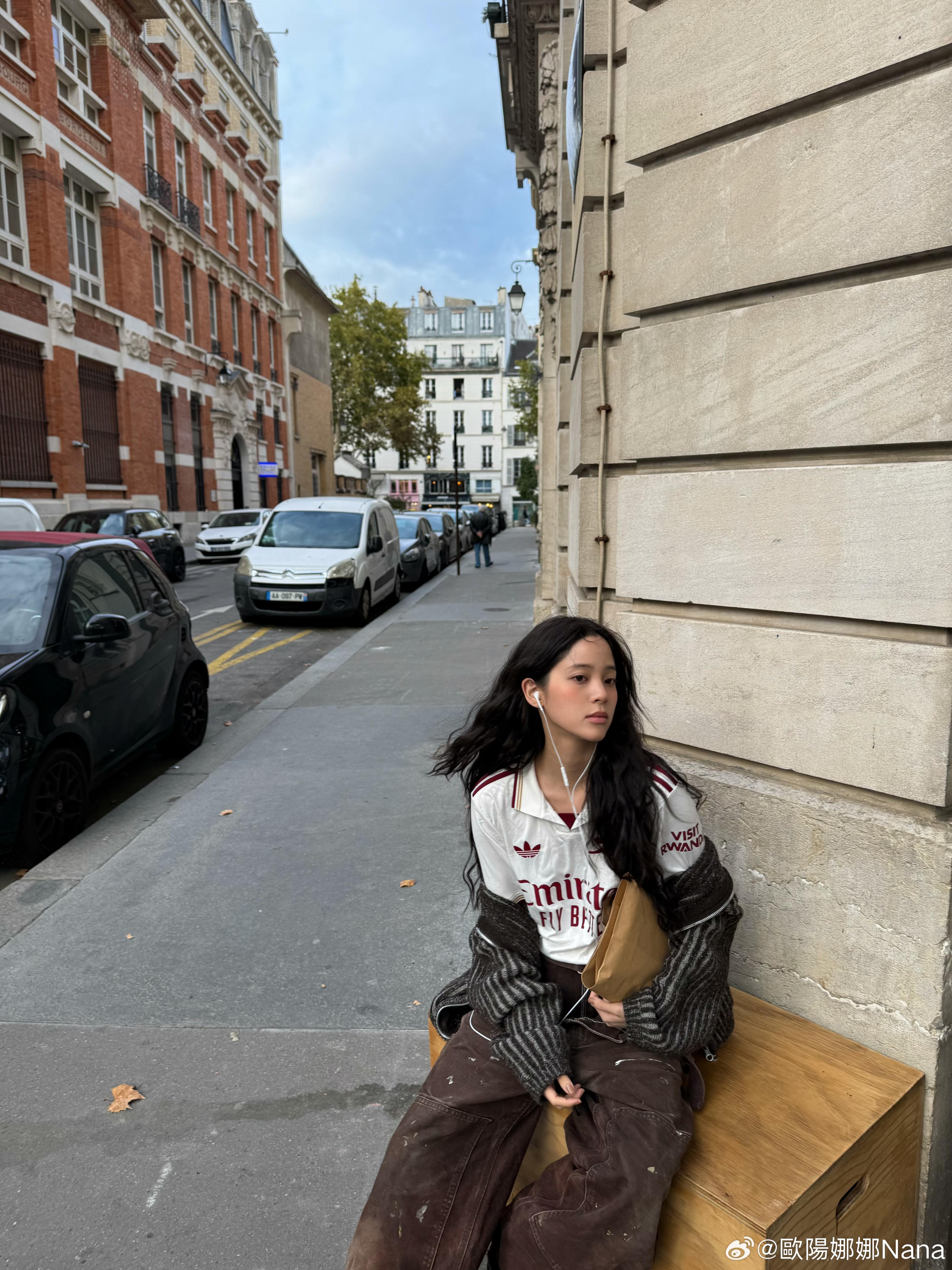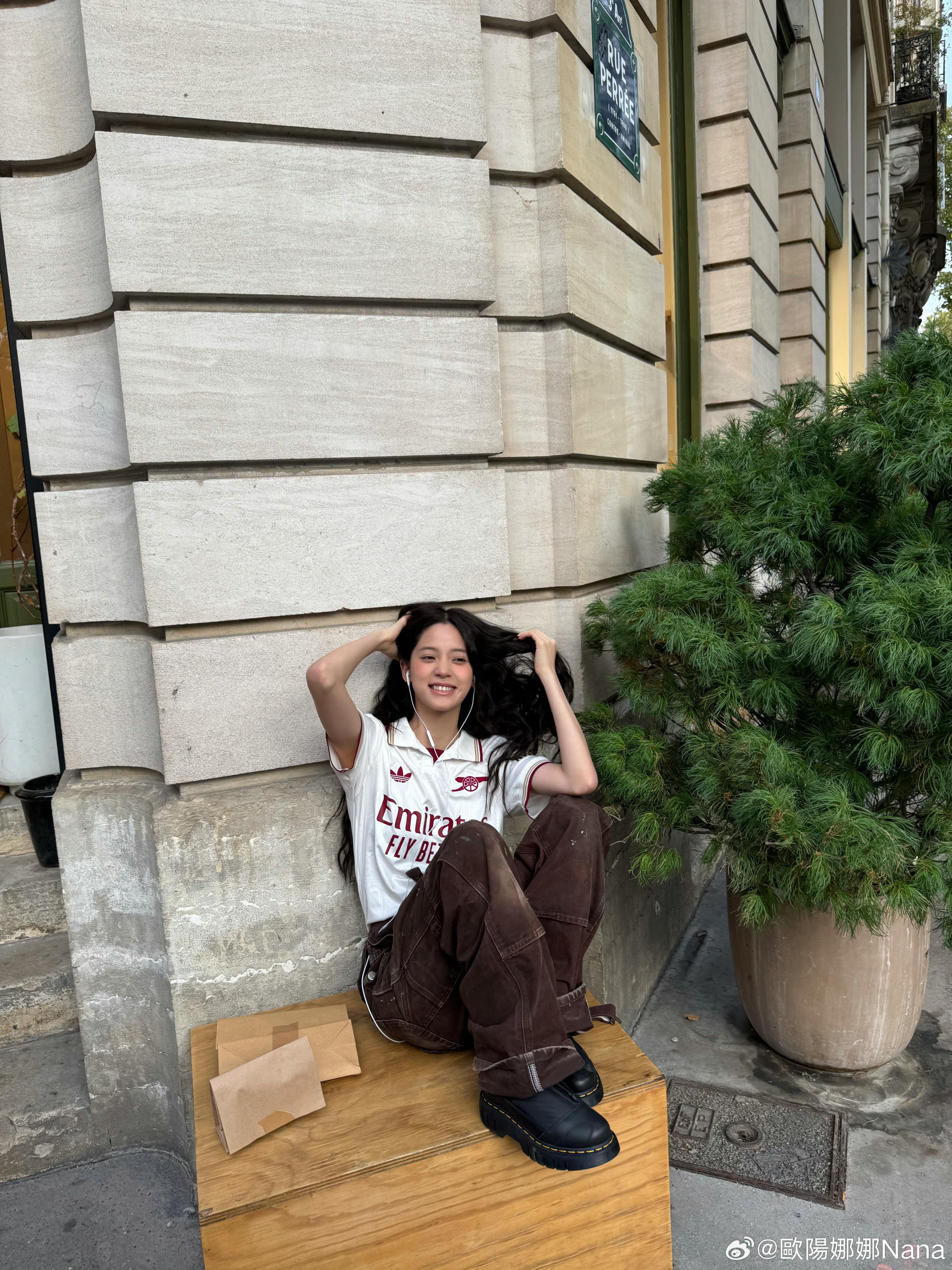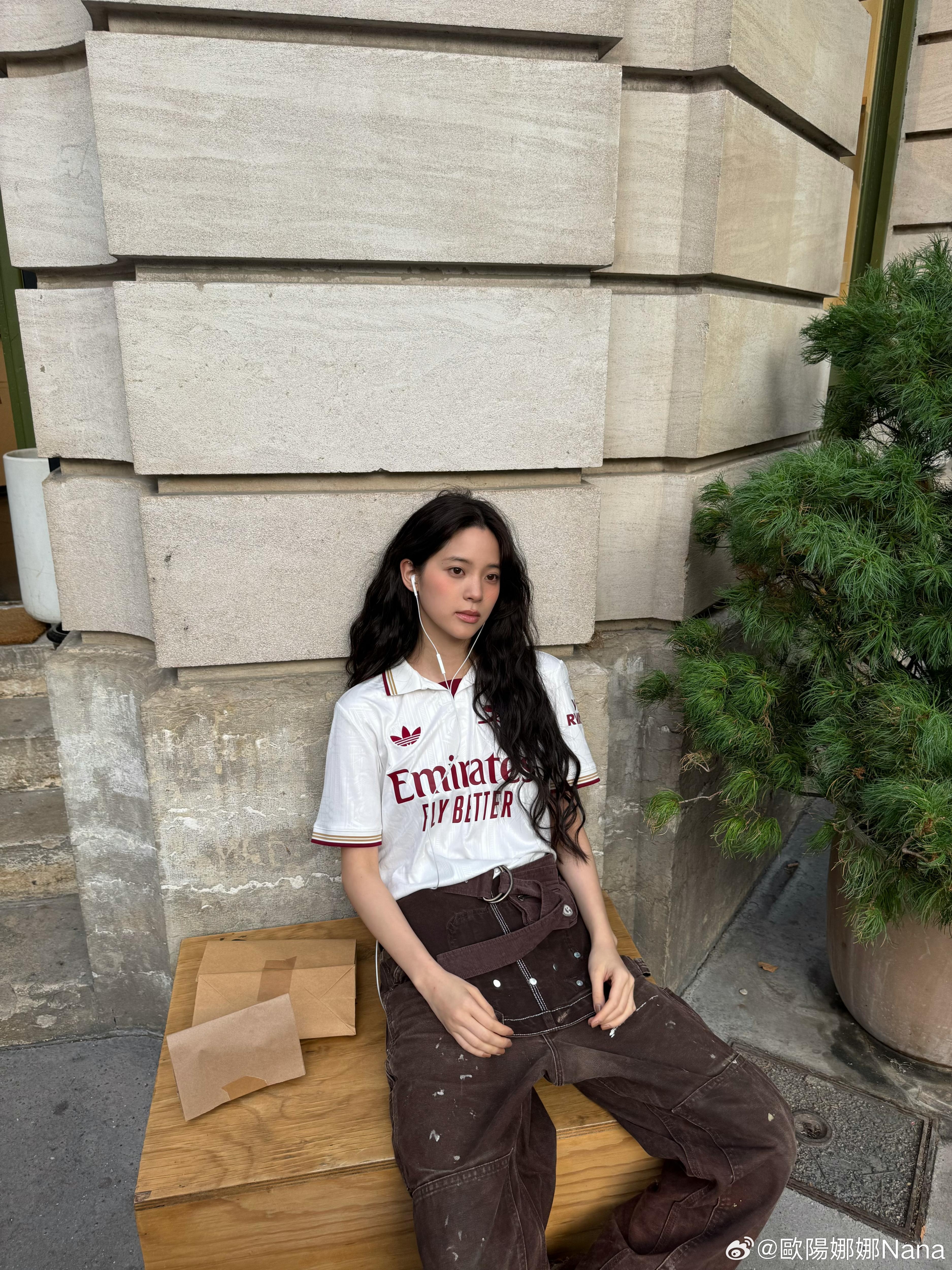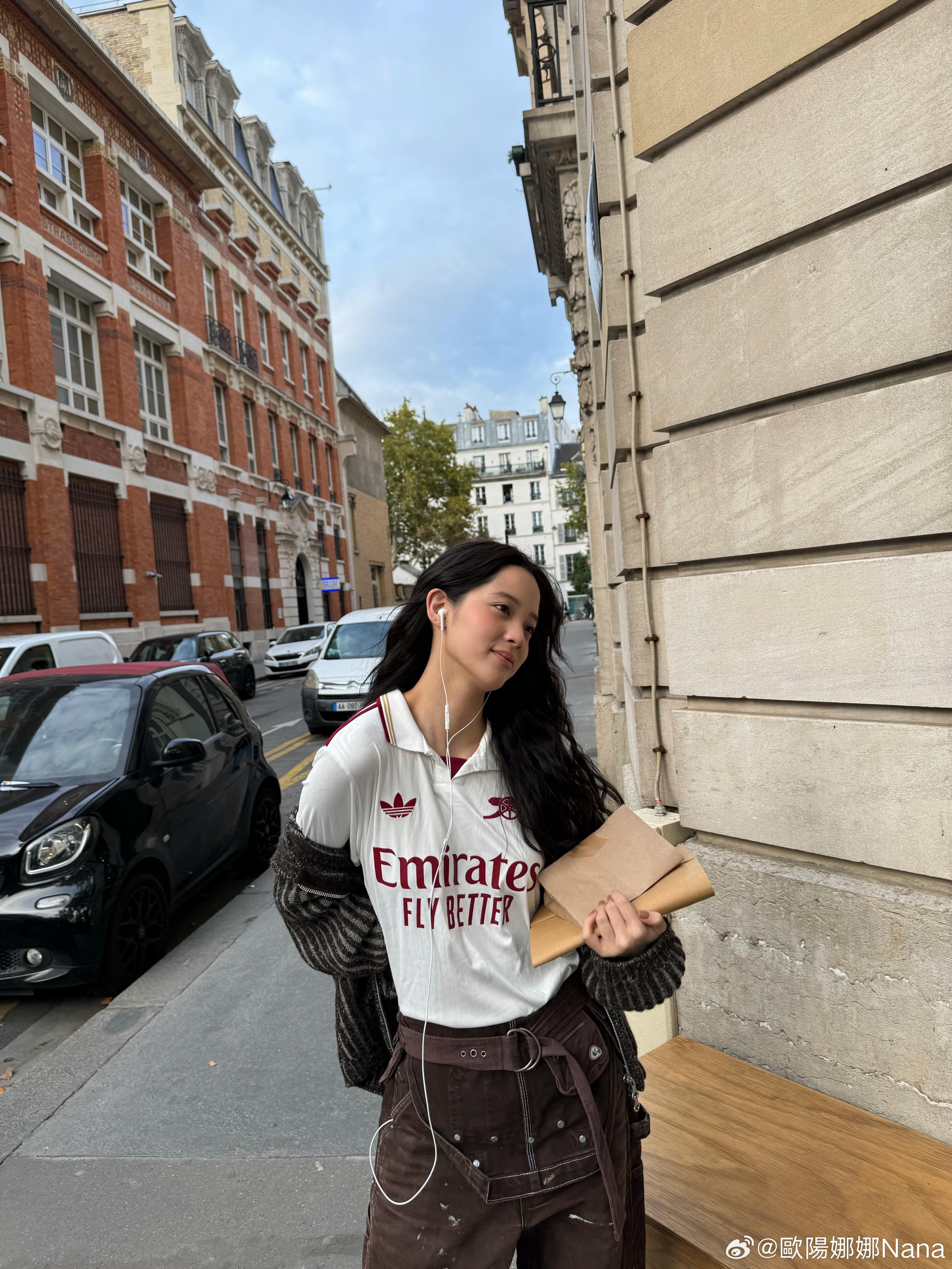 10月05日讯 女艺人欧阳娜娜更新社媒,晒出了自己身穿阿森纳第二客场应战 运动活动 服 在巴黎街头漫步的照片。