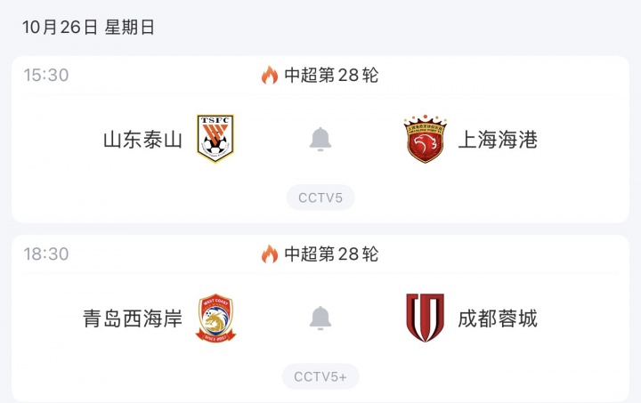本周日海港将在职业联赛 客场应战 应战 泰山,追赶 2分的蓉城将客场应战 应战 西海岸。