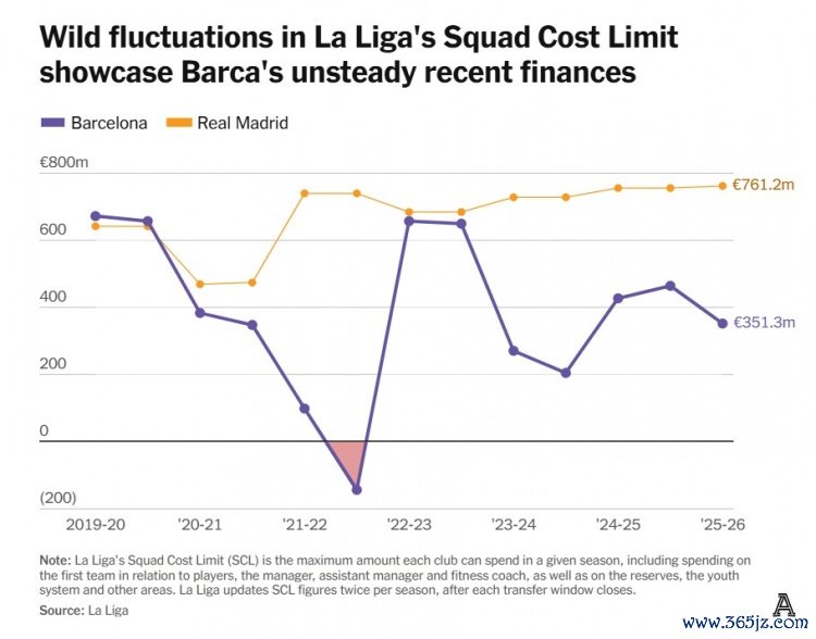 西甲球队成本上限的剧烈波动凸显了巴萨近期财务状况不稳定
