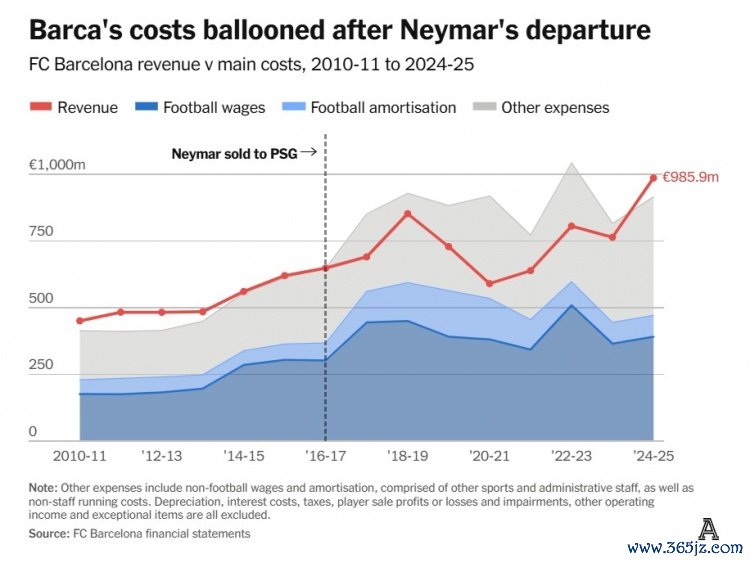 在计算巴萨这种级别俱乐部的其他运营成本前,每1欧元中就有81分被球员相关成本吞噬。而这些其他成本历来高昂。俱乐部财务结构快速 恶化。