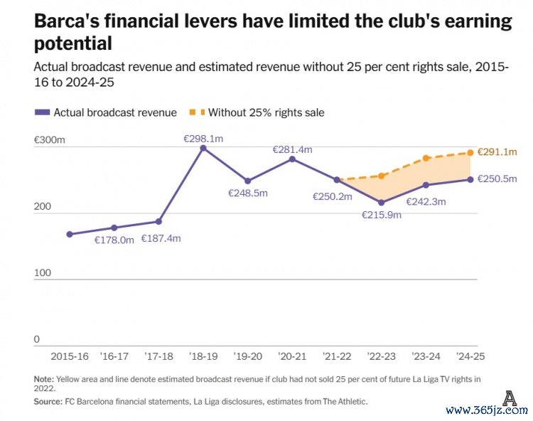 自与第六街交易以来,巴萨已移交约1.2亿欧元转播收入,占杠杆融资额的18%。即便西甲转播权价值直至2047年合同到期维持不变,巴萨放弃的转播收入总额将达10亿欧元——比2022年出售权益所得高出50%。实际上,这笔交易相当于一笔利率3.5%的25年期贷款,且这还是在转播权不增值的前提下。