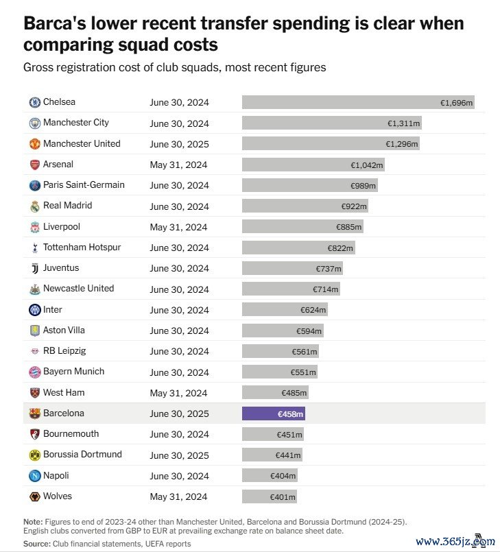 当比较球队成本时,巴萨近期较低的转会支出显而易见