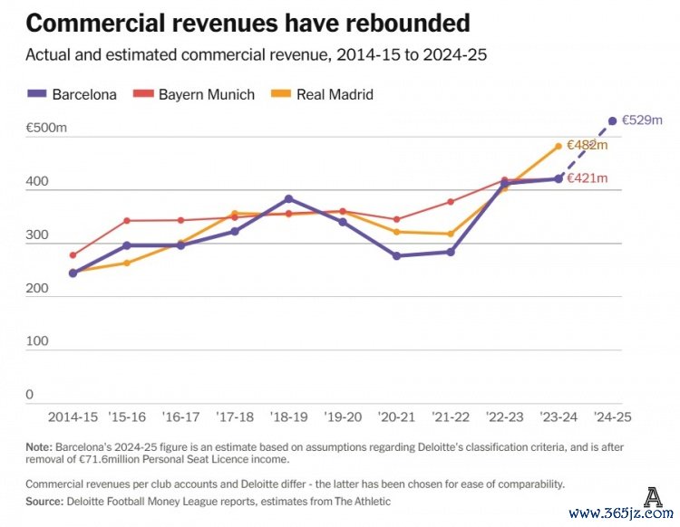 增长仍在延续。巴萨将PSL收入计入商业项,但即便视其为一次性收益剔除,按德勤口径估算,其商业营收可能仍冲破 5亿欧元。