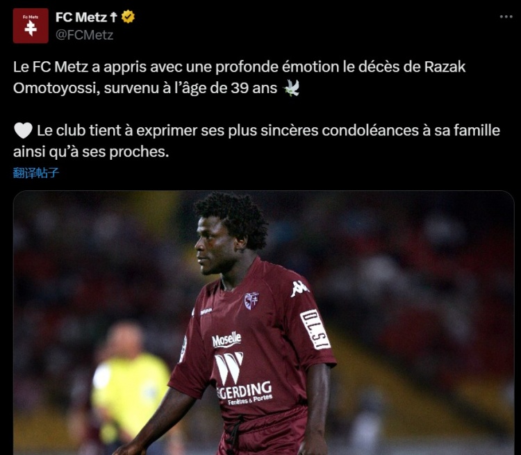 梅斯官方写道:“俱乐部怀着深切的哀痛之情得知奥莫托约西不幸去世,享年39岁。俱乐部向他的家人及亲友致以最诚挚的慰问。”