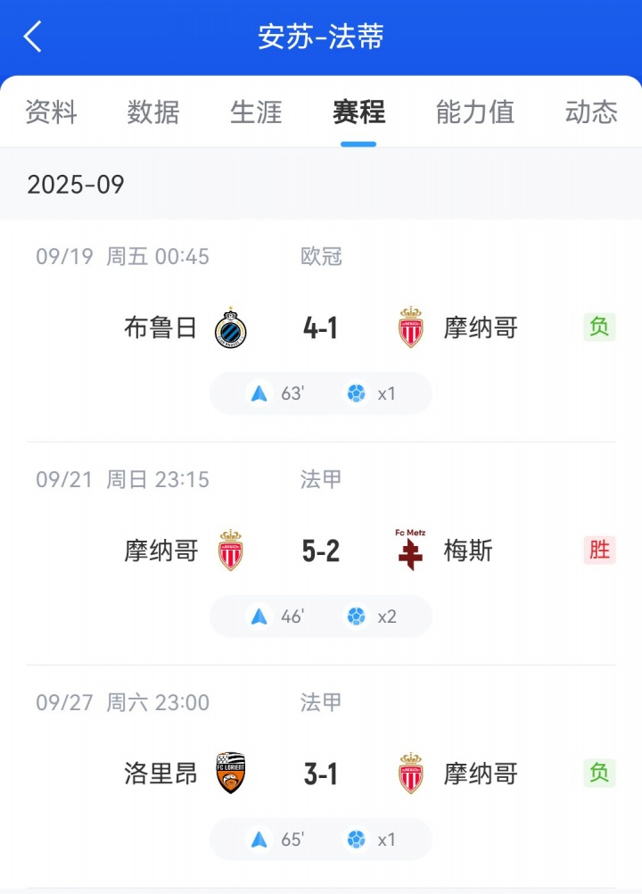 目前,法蒂已经为摩纳哥出战3场赛事 (均为后备 登场),并在为数不多的上场时间中打进了4个得分 。