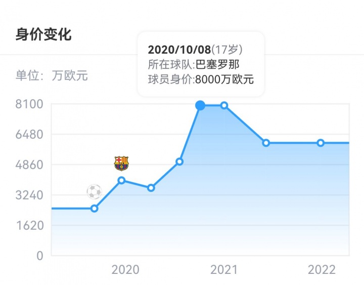 他在2020年达到了个人巅峰期 身价8000万欧元,但随后受困于连续受伤 ,身价一路走低,目前仅剩500万欧。