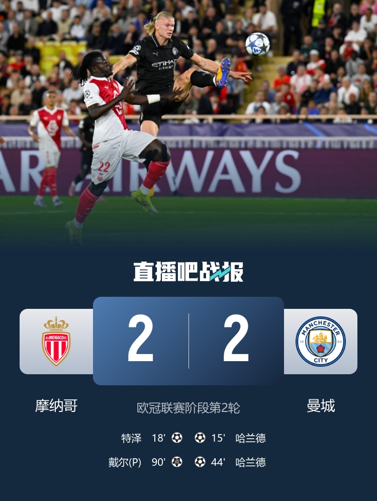 曼城2-2遭摩纳哥绝平,哈兰德打入两球,但曼城没能收获胜局。
