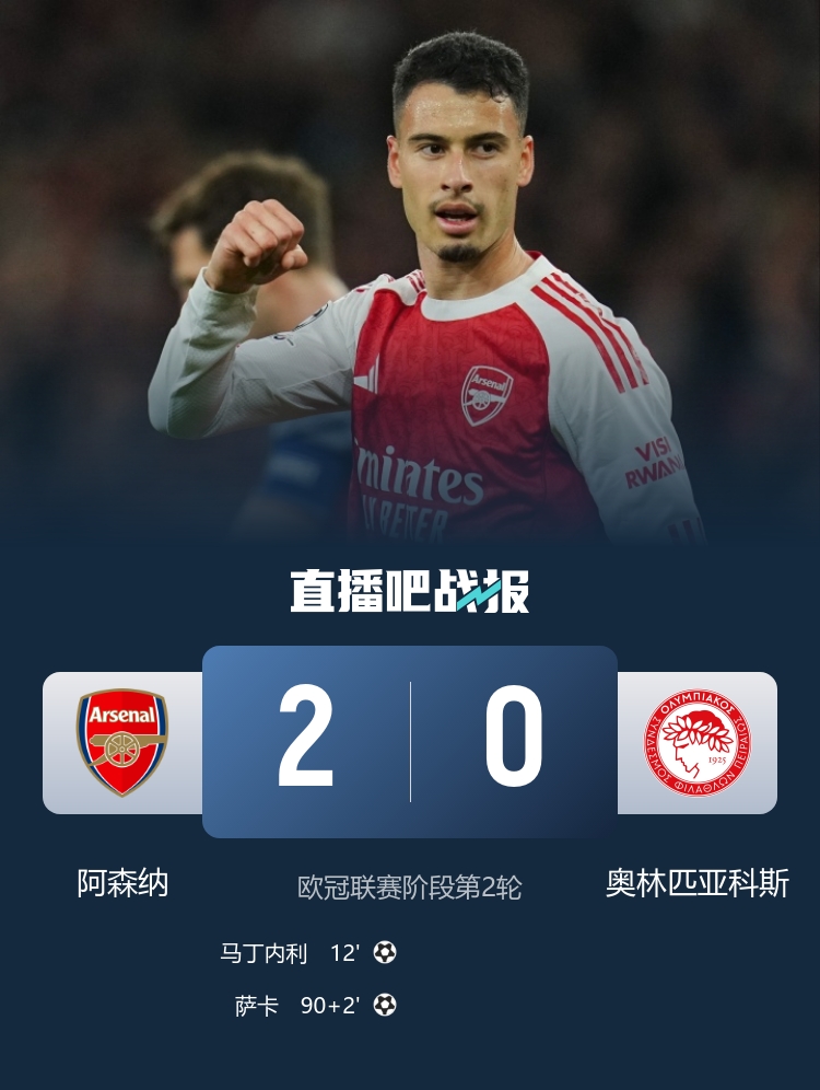 阿森纳本轮2-0击败奥林匹亚科斯,马丁内利、萨卡各入一球,小领队 厄德高表现出色。