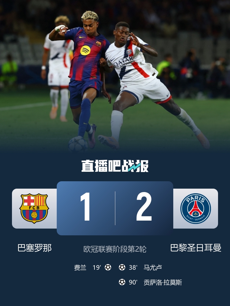 欧冠本轮焦点对阵,巴萨主场作战 1-2遭巴黎致胜球 ,本场巴黎缺兵少将,仍然拿下三分!