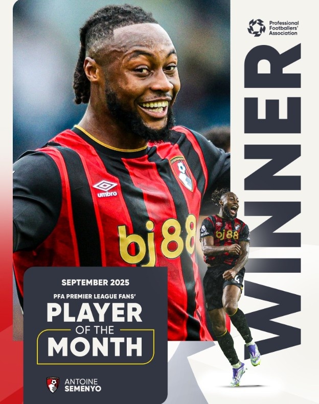 10月13日讯 PFA(英格兰职业球员工会,Professional Footballers' Association)官方宣布,伯恩茅斯翼锋塞梅尼奥当选球迷票选英超9月最佳球员。