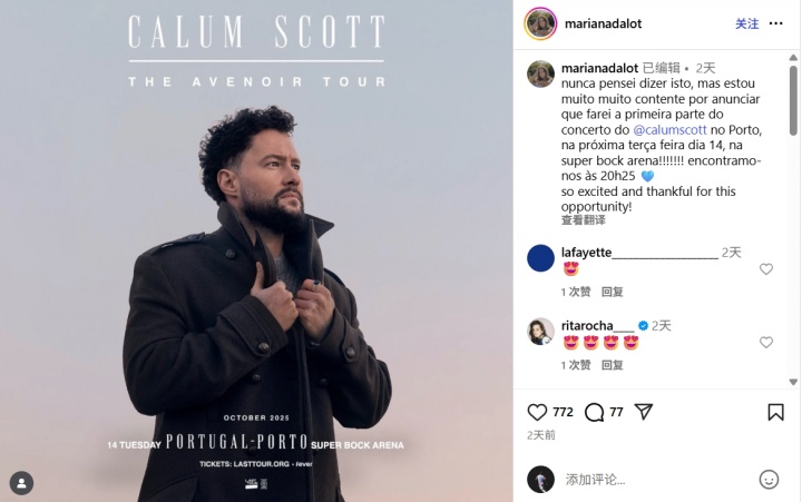 玛丽安娜-达洛特在社交媒体上写道:“我从未想过自己会说出这句话,但我非常高兴地宣布,我将在下周二,10月14日,免费欧洲杯直播于波尔图的超级波克竞赛 场为卡尔姆-斯科特(Calum Scott)的演唱会担任开场嘉宾!我们晚上8点25分见,我对此机会感到无比兴奋和感激。”