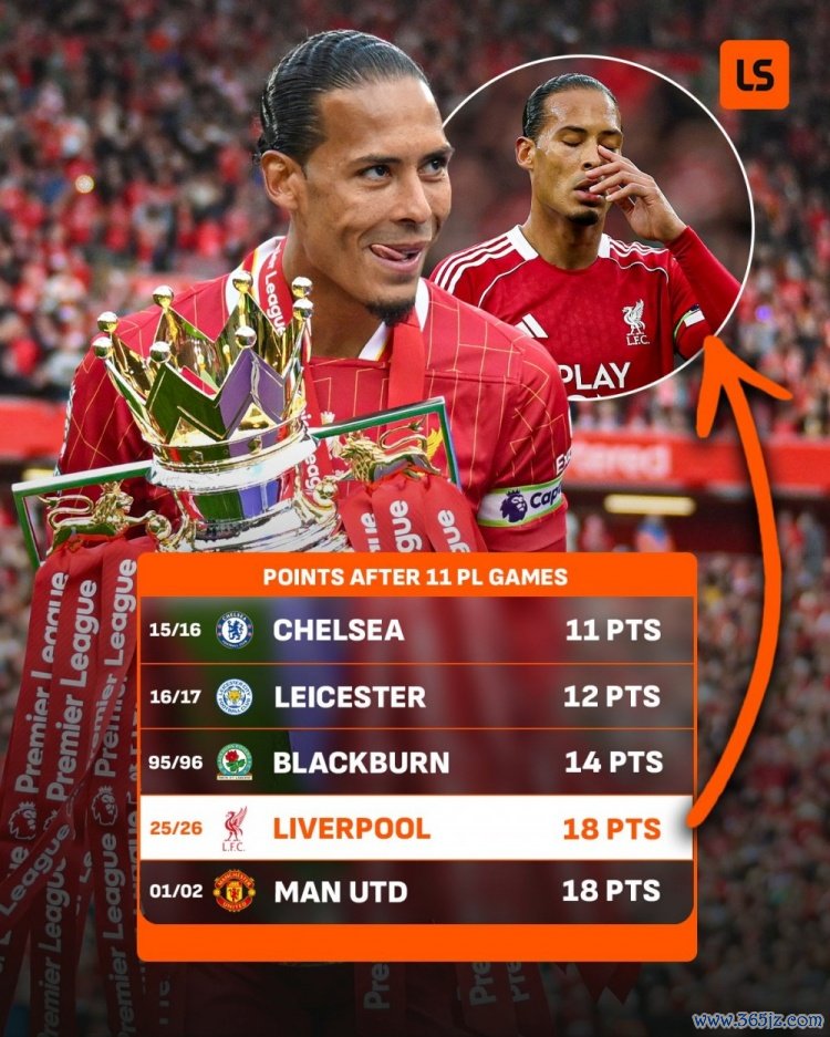 11月11日讯 利物浦在本轮英超焦点战0-3大败 曼城,数据统计 显示他们也是历史同期前11轮积分第4少的英超蝉联第一名 第一名 。